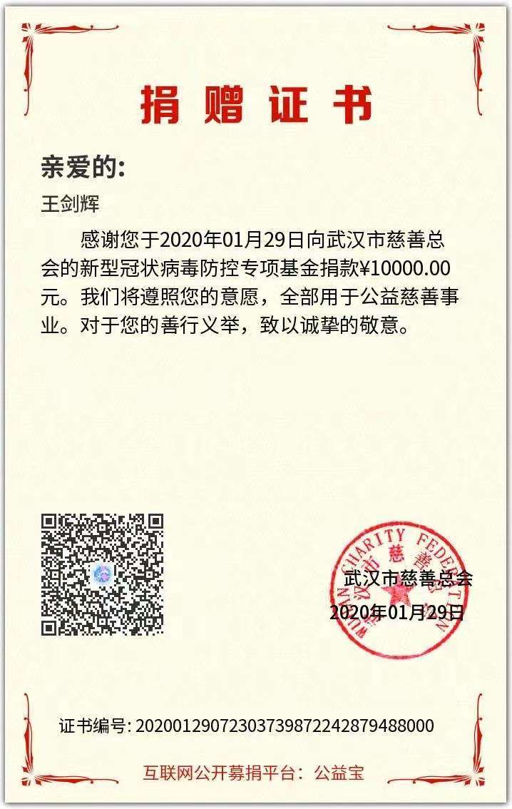 山東老字號魯味齋向武漢市慈善總會的新型冠狀病毒防控專項基金捐款壹萬元